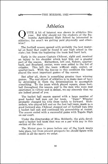 PAGE 30![]() ATHLETICS Quite a bit of interest was shown in athletics this year. But why should not the students of the Itawamba Agricultural High School be interested in athletics; for aren't we getting paid physically and otherwise? The football season opened with probably the best material on hand that could be found in any high school in the state; but from the beginning the team had hard luck. Early in the season Captain Chilcoat, right end, received an injury to his shoulder which kept him out a greater part of the season. Richardson, left end, Nabers, quarterback, and Bourland, center, were soon added to the list of cripples. This left the team without ends, center, or quarter-back. With the lineup in this condition, the team played the most important games of the season. But after all, there is something greater than winning games. The real object of athletics is to make men of boys by developing in them the determination to accomplish something. To the team which played square, clean foot-ball throughout the season, and to the men who were real sportsmen in victory and in defeat, we say sincerely that we are indeed proud of you. The basket ball season opened with a large number of good basket ball men out for team. "Jiggs" Wheeler promptly changed his title from tackle to forward. Richardson, who played left end on the foot ball team, made us a good forward also. Chilcoat stepped out of football togs into a basket ball suit and continued his generalship at center. The season ended with a successful game with Tupelo High on our court. Under the directorship of Miss Mobberly, the girls developed a basket ball team that was on a par with any in this section of the state. The Mirror goes to press before any of the track meets take place, but from present prospects we should figure with credit in all the meets we enter. Previous Page Contents Page Next Page