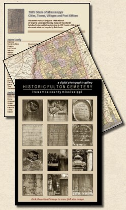 ![]() SPECIAL ONLINE PUBLICATIONSView Early Deeds of Itawamba County, including a history of early Itawamba and a deed plotting tutorial. This 47-page PDF publiucation (850 kb) is fully indexed including a Chickasaw name index, a slave name index and a full name index.View Mantachie Town Photographs taken during the year 1920. These photographs were taken on Main Street (currently Church Street) in the business district. View the Directory and Historical Sketch of Fulton Station Methodist Episcopal Church South. Now known as First United Methodist Church in Fulton, this 12-page booklet was published during 1934. View the Chancery Index: 1836-1900 which contains and alphabetical and numercial index of the probate packets found in the Itawamba County Chancery Court Clerk's office in PDF Format. This 103-page online book is a valuable tool in researching Itawamba County probate records. 650 kb (Requires Adobe® Reader®) View the Every-Name Index of the excellent research book Mother Monroe in PDF Format 470 kb (Requires Adobe® Reader®) View the 1898 Grand Jury Pension List Digital Images View the Fulton Southern Herald Digital Images: 1860 View the 1891 Cram's Mississippi Map View the Itawamba Archival Photograph Collection View the Itawamba County Research Directory and Address Book Download the Research Map of Itawamba County Download the 1885 Mississippi Cities, Towns and Villages Directory (Requires Adobe® Reader®) Download the Society Membership Brochure in PDF Format (Requires Adobe® Reader®) View the Old Fulton Cemetery Gallery View the Complete 1922 Itawamba Agricultural High School Yearbook View the Complete 1921-22 Itawamba Agricultural High School Student Handbook View the Judson Baptist Association Minutes: 1889 View the Marriage Book 6 Index Pages: 1861-1866 View the Mississippi Indian Cession Map from the 1891 Goodspeed's Biographical and Historical Memoirs of Mississippi (583kb jpeg file) |